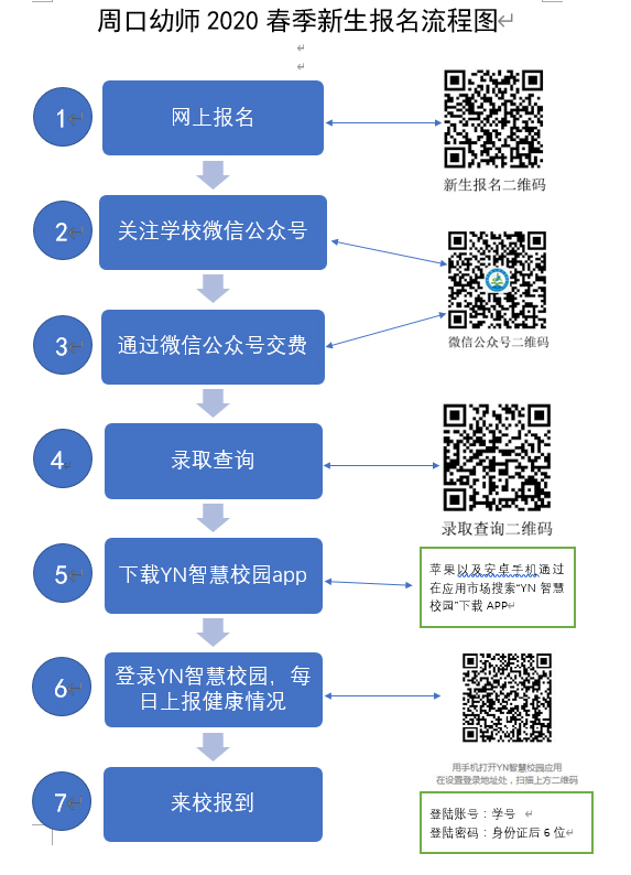 1、学生报到具体流程为:大门口测体温、扫码填写个人健康信息---行李消毒---进校门(行李老师接)---进入广场找自己班级---填写入学注册表、再次测体温并上交健康证明---领取宿舍分配表---扫码填写健康信息进入公寓楼---进入本人宿舍(不准乱串寝室)。