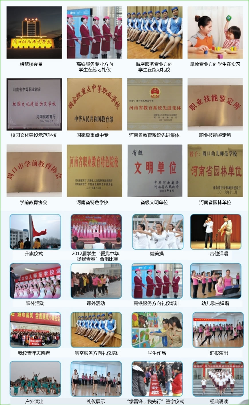 周口幼儿师范学校(原淮阳师范),是一所经河南省人民政府批准,周口市政府举办的全日制公办中等职业学校,是实施学历教育、独立设置的幼儿师范学校。学校坐落在历史文化名城——淮阳,始建于清宣统元年(1909年)3月,初名陈州府初级师范学堂,是河南省创办最早的师范学校之一。曾先后更名为河南省立师范学校、省立第二师范学校、河南省淮阳师范学校。建校近百年来,为国家输送数万名建设人才,被誉为“豫东教师的摇篮”。2002年9月,经河南省人民政府批准更名为河南省周口幼儿师范学校,是河南省九所幼儿师范学校之一,也是周口市唯一一所独立设置的具有办理学前教育教师资格证的幼儿师范。2011年市政府批准,学校整体搬迁至周口市东新区,先后与周口师院、郑州幼专联合举办五年制学前教育专科教育,百年名校,再铸辉煌。